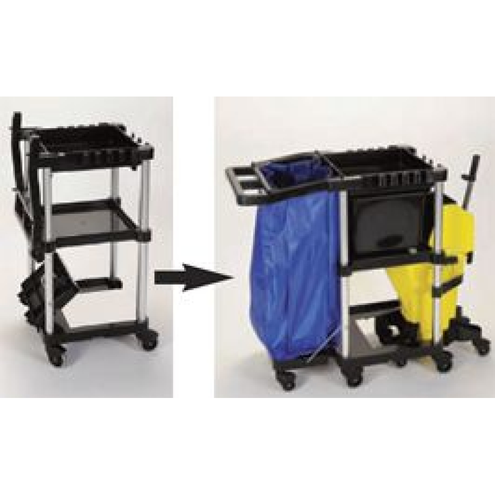 De SYR werkwagen enkel module is all-inclusief. Hij heeft een vak bij de handvat met een deksel waar een grote zak aan vast zit. Er zit een haak op zodat er borden op gehangen kunnen worden. Voor de vuilniszakken krijg je een elastieken band om ze vast te zetten. Wat ook inbegrepen is zijn 4 gekleurde emmertjes die passen aan de bovenkant van de SYR werkwagen, in 4 kleuren (groen, rood, geel en blauw) en allemaal hebben ze een handvat. De reden dat de SYR werkwagen ook de spacesaver trolley genoemd word komt doordat hij zeer compact is, hij is in te vouwen dus makkelijk om te vervoeren en op te bergen.