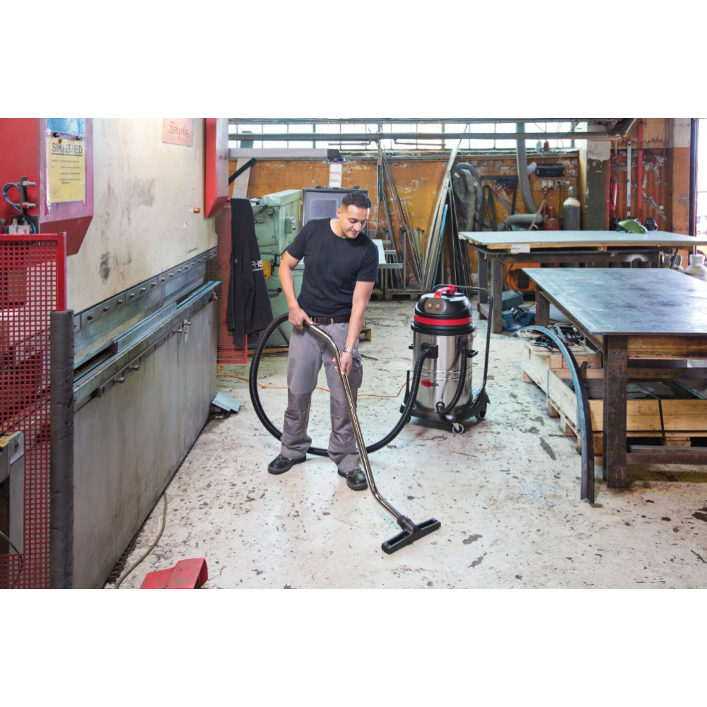 De VIPER LSU serie nat-/droogzuigers heeft een modulair ontwerp met uiteenlopende tankinhoud en aantal motoren. De tankinhoud van de VIPER LSU 155 nat-/droogzuiger is 55 liter, en hij heeft één motor. U kunt kiezen voor een roestvast stalen tank of een rode kunststof tank. Hij is uitgerust met een afvoerslang en u kunt de tank eenvoudig legen zonder de motor te verwijderen. Hij heeft grote achterwielen en draaiende voorwielen die hem licht en gemakkelijk wendbaar maken. De VIPER LSU 155 nat-/droogzuiger wordt standaard geleverd met de volgende accessoires: spleetmondstuk, plumeau, zuigmond voor nat zuigen en zuigmond voor droog zuigen.